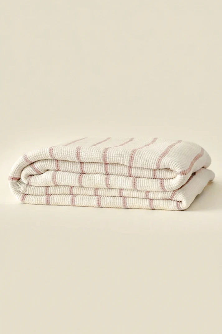 Ce couvre-lit haut de gamme en 100 % coton présente une structure crinkle à 8 couches qui, grâce à son rembourrage, offre une sensation de couchage douce, moelleuse et agréablement matelassée. Le design réversible – une face crème avec de fines rayures rosé, l’autre en crème uni – crée une atmosphère apaisante et naturelle tout en offrant des possibilités de style polyvalentes pour des chambres modernes comme intemporelles.