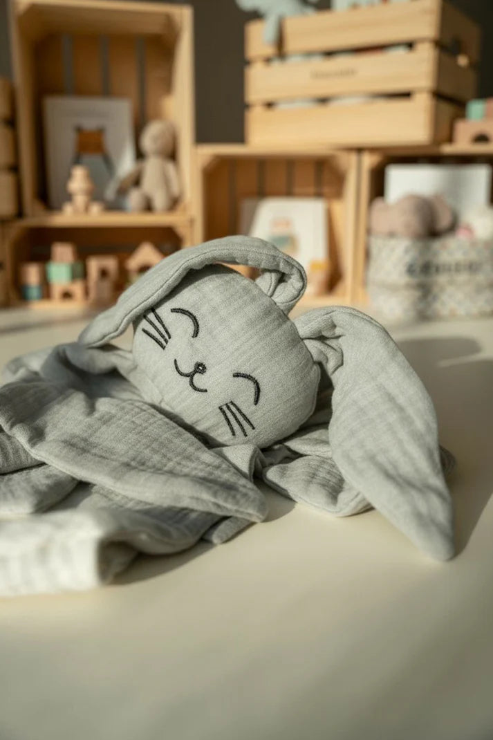 Lingette câline en mousseline avec tête de lapin – Vert sauge